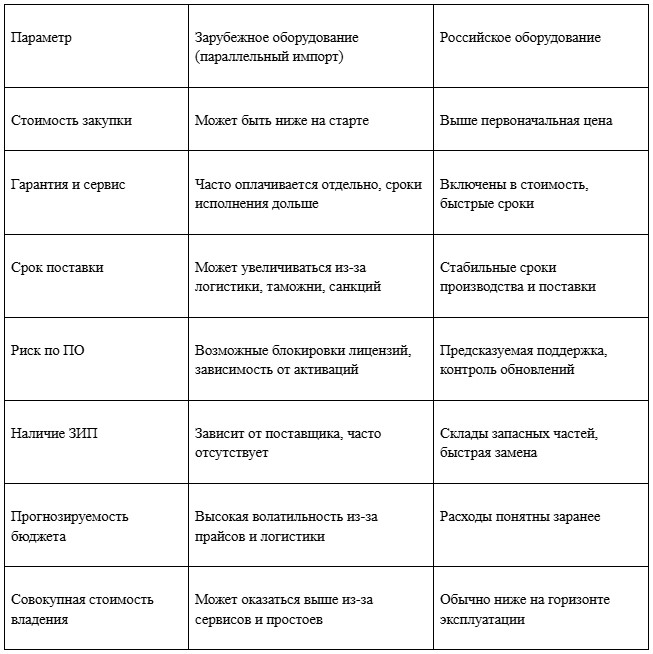 У поставщика иностранного оборудования ситуация иная. Когда он ввозит технику по параллельному импорту, ответственность за гарантию и сервис ложится целиком на него. Чтобы обеспечить тот же уровень поддержки, что у российского производителя, ему приходится самостоятельно содержать инженеров, закупать ЗИП, организовывать сервис 24/7. Эти издержки приходится распределять на ограниченное число клиентов, что резко повышает себестоимость. В результате поставка иностранного оборудования через такого поставщика часто оказывается дороже в совокупных затратах, чем покупка российских решений. Именно поэтому оборудование российских вендоров при всех прочих равных обеспечивает более низкие совокупные расходы на владение и обслуживание — и в долгосрочной перспективе оказывается выгоднее.
