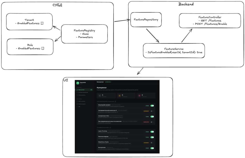 Многие команды пишут свою систему флагов с хранением состояния в базе данных. Это удобно, когда нужна гибкость и привязка к доменным сущностям: конкретным пользователям, ролям, тенантам или чему-то специфичному для вашего бизнеса.