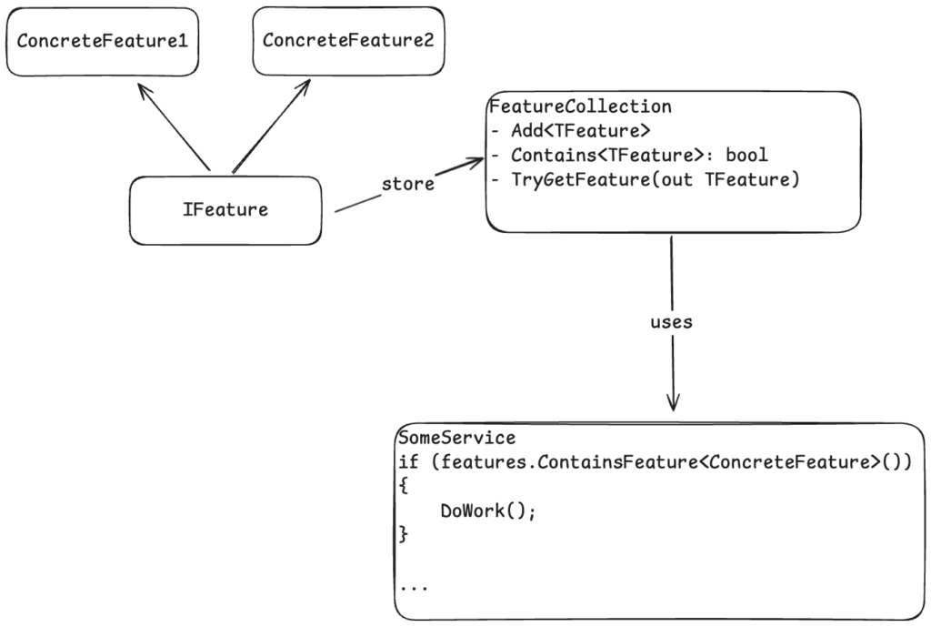 ASP.NET Core использует похожий паттерн — IFeatureCollection в HttpContext. Только там он нужен для описания возможностей среды выполнения (поддерживает ли сервер WebSockets, HTTP/2 и т. д.), но сама идея отлично подходит и для фича-флагов.