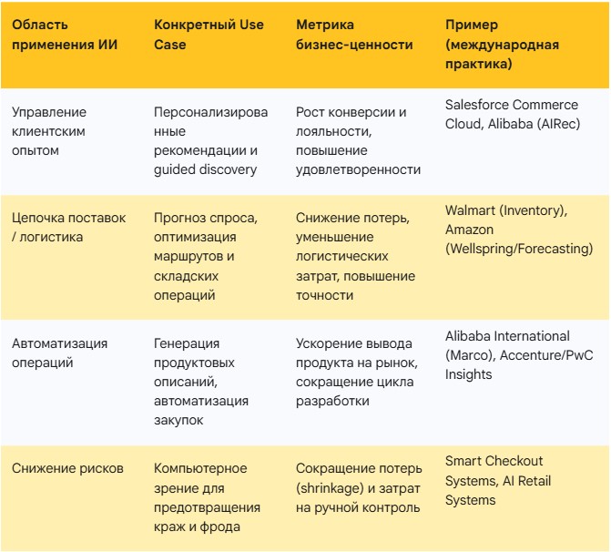 ИИ полностью изменил розничную торговлю. Amazon и Alibaba применяют генеративный ИИ и агентные системы для беспрецедентной работы логистики, контента, обслуживания клиентов. Глобальный стандарт технологической зрелости высок.