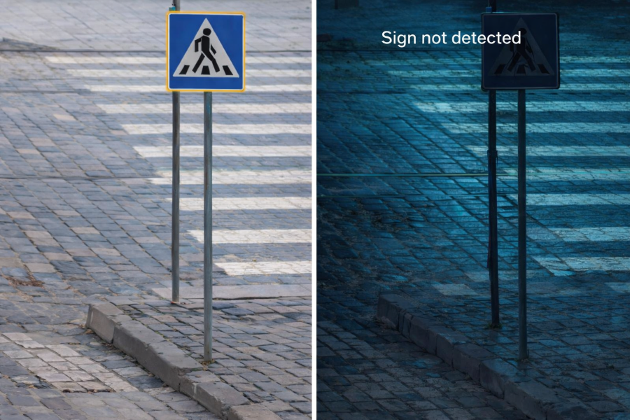 Пример: представим задачу детекции дорожного знака «Пешеходный переход». Модель обучена на датасете, собранном днем: четкий контраст, естественный свет. В этих условиях система корректно выделяет знак и обводит его рамкой. Но с наступлением вечера меняется освещенность, появляются отражения от мокрого асфальта, усиливается шум матрицы камеры, смещается цветовая температура. В этих условиях точность падает — растет число пропусков, и система перестает стабильно фиксировать знак.