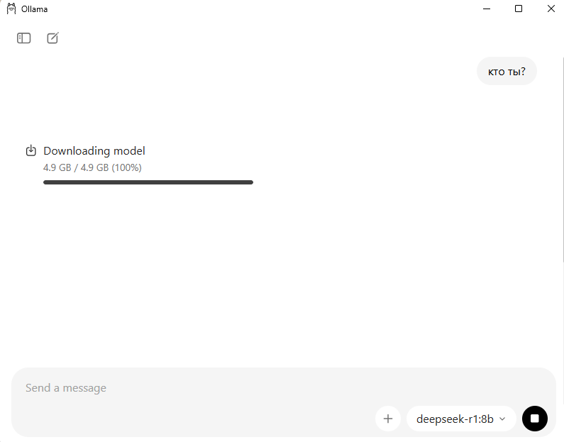 Ollama имеет простенький графический интерфейс, позволяющий в режиме чата запускать промпты, выбрав модель. При этом, если модель еще не скачана на компьютер, она начнет скачиваться после отправки первого промпта к ней.