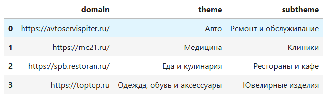 Чтобы затестить работоспособность нашего алгоритма, предложим ему определить тематику нескольких случайных сайтов, которые я достал из поисковой выдачи: