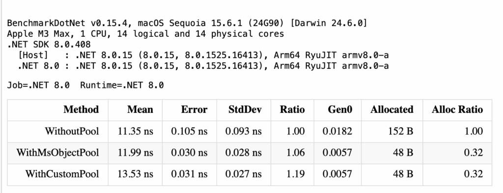 Давайте сравним производительность нашего кастомного пула со встроенным ObjectPool<T>: