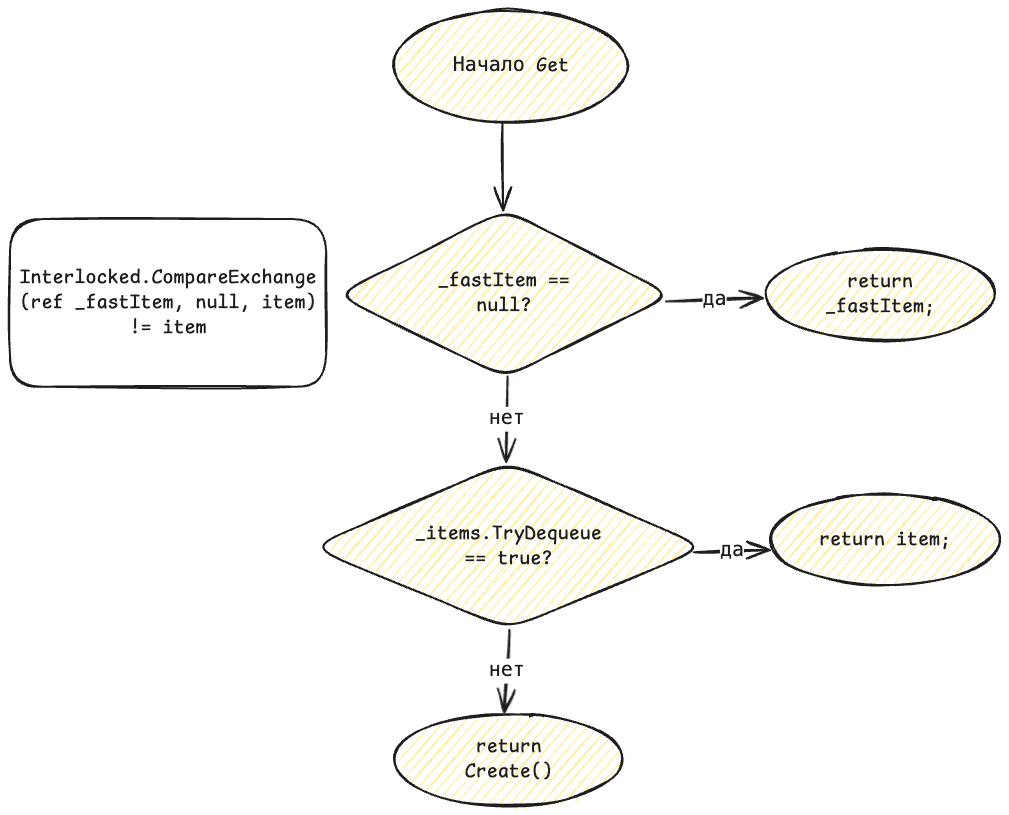 _fastItemравенnullили уже используется другим потоком, алгоритм пытается извлечь объект из_items. - Если получить значение и из