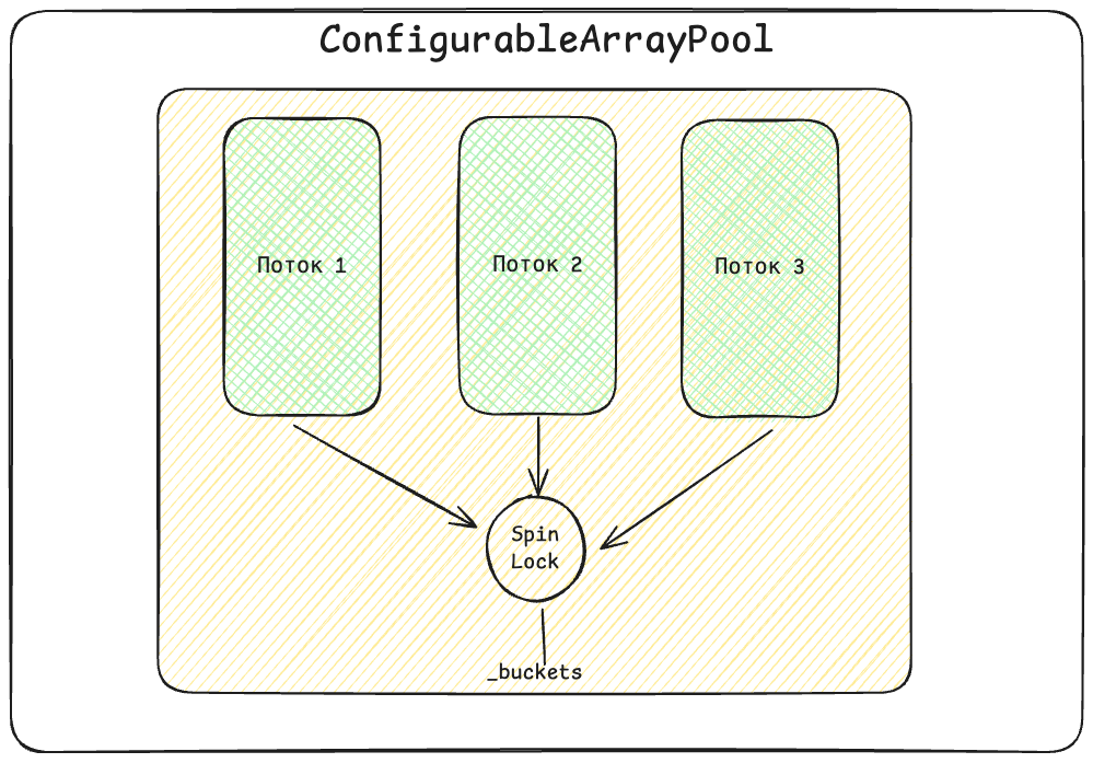 В этом примере мы уже используем ConfigurableArrayPool, который устроен чуть проще: он содержит только один уровень кеширования — массив _buckets с массивами для выдачи. А для синхронизации между потоками используется SpinLock.