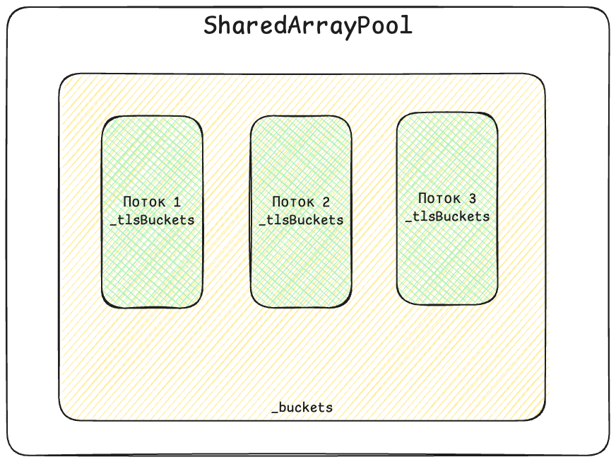 SharedArrayPool под капотом имеет сложную логику: он состоит из бакетов (_buckets), которые уже хранят в себе массивы разной длины. Видов бакетов несколько: есть thread local бакеты на каждый поток, а есть общий кеш бакетов на все потоки.